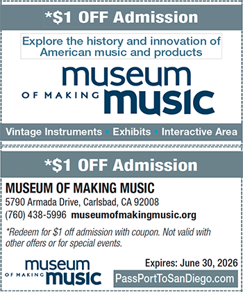 Take note of this completely remodeled interactive museum celebrating its 25th anniversary, a tribute to the love of all things music! Nestled between LEGOLAND and The Flower Fields in Carlsbad, the museum invites visitors to discover the stories of how musical instruments are made, how they change over time, how they move from maker to retailer and into the possession of those who play them. Newly designed galleries include a panoramic multimedia display, video stories, photos, hundreds of artifacts, and performance clips by major artists. Equally entertaining are “Sit & Play” stations with a variety of stringed instruments, including banjos and guitars. Visitors of all ages will also love the Interactive Gallery, which encourages guests to try out tambourines, ukuleles, bongos, electronic drums, and other unique musical instruments. In Spring 2024, the museum enjoyed a grand reopening after enhancing its galleries and upgrading play and performance areas to cater to different age groups: one that touts a selection of electronic instruments for older students, and another packed with accessible instruments for budding Beethovens. The museum also regularly presents live concerts by award-winning artists. Open 10 a.m. to 5 p.m. Tuesdays through Sundays.