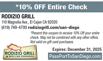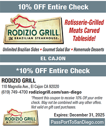 Watch “gauchos” carve rotisserie-grilled meats tableside at this brand new Brazilian steakhouse in downtown El Cajon. Since opening in November 2024, the East County venue has quickly become a family favorite and celebration destination. The authentic churrascaria-style restaurant offers a wide range of premium cuts, such as picanha (prime part of top sirloin), flavorful maminha (tri-tip), grilled fraldinha (flap steak), bife com alho (a tender cut of beef basted with the restaurant’s traditional house garlic rub), bife com parmesão (Parmesan sirloin steak) and tender ribeye steak. Several meats and other local selections are served as Rodizio Grill Chef’s Special. Also savor frango com bacon (bacon-wrapped chicken), and slow-roasted galeto (bone-in chicken thigh), which is marinated overnight. Tasty glazed pineapple on the skewer – a guest favorite — elevates flavors to another level. Leg of lamb and a daily fish selection are also available. Not to be missed is the all-you-can-eat gourmet salad bar, filled with signature salads, fresh fruits and vegetables, countless cheeses and cured meats and much more. Hot side dishes, fresh-pressed juices, cocktails, extensive wine and beer offerings, and homemade desserts round out the bountiful menu. For an unforgettable culinary experience, visit this sizzling hot spot, open daily. Reserve a table at rodiziogrill.com/san-diego