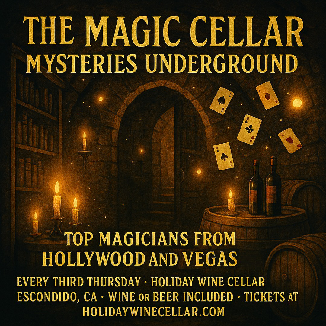 🎩 Magic Cellar of Mystery, Wine & Wonder with Terry Luceford Sip. Laugh. Be amazed. Doors open at 6 PM | Show at 7 PM 🎟️ Grab tickets now About Holiday Wine Cellar Explore this famous Escondido landmark, boasting an outstanding selection of craft beer, wine, rare spirits, non-alcoholic beverages and more, accompanied by premium-level service and traditions since 1965 Discover and immerse yourself in the unparalleled inventory at this long-standing, family-owned landmark celebrating its 60th anniversary in 2025. Admire the expertly curated rows of neatly organized import and domestic wines and rare and exclusive spirits, and explore the extensive...