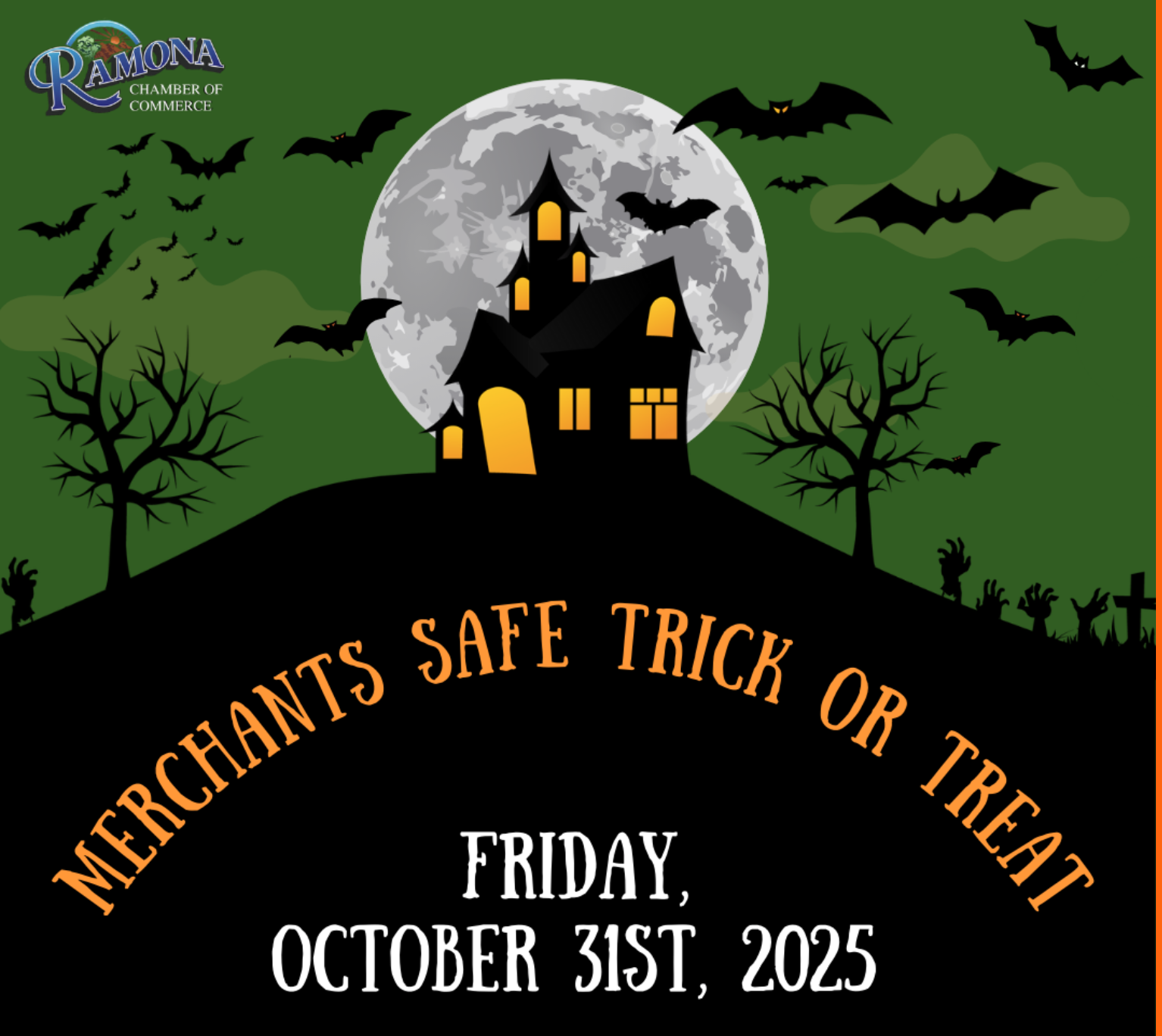 Every year, the Ramona Chamber of Commerce presents Merchants Safe Trick or Treat, where Main Street businesses open their doors to hand out candy and other goodies to participating children. Come out and enjoy their most spooktacular Halloween event! For more information and sponsorship opportunities. Click here.